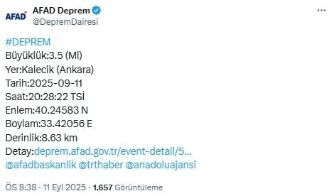 Depremin merkez üssü Ankara Kalecik olarak belirlendi. 3.5 büyüklüğünde meydana gelen deprem yerin 8 kilometre derinliğinde gerçekleşti.