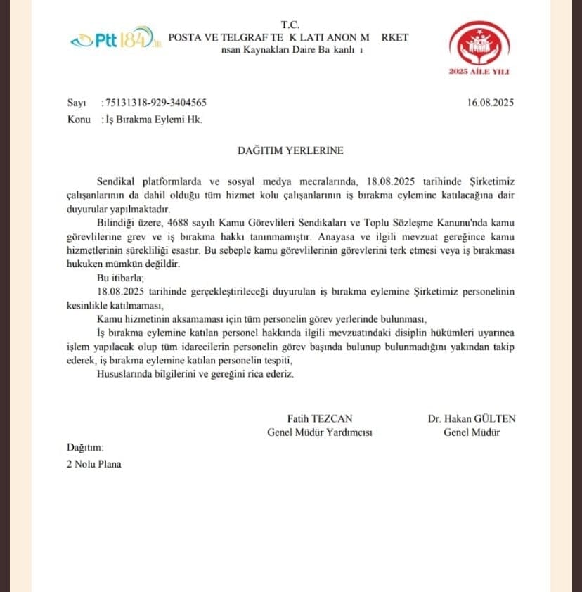 Kurum çalışanlarına gönderilen yazılarda 18 Ağustos 2025’te yapılacak iş bırakma eylemine kesinlikle katılmamaları, kamu hizmetinin aksamaması için tüm çalışanların görev başında olması gerektiği, eyleme katılan olursa disiplin işlemleri başlatılacağı belirtildi. Çalışanlara gözdağı verilen yazıda yöneticilerin çalışanları yakından takip ederek eyleme katılanların belirleneceği belirtildi.