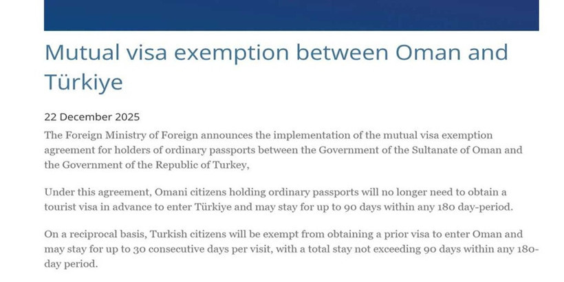 Türkiye ile Umman Sultanlığı vizler konusunda karşılıklı anlaşmaya vardı. Umman Dışişleri Bakanlığı, vize muhafiyetine ilişkin detayları açıkladı. Yeni düzenlemeye göre sıradan pasaport sahibi Umman vatandaşları, Türkiye’ye giriş için önceden turist vizesi alma zorunluluğundan muaf tutulacak. Umman vatandaşları, 180 günlük süre içinde Türkiye’de 90 güne kadar vizesiz kalabilecek. Anlaşma kapsamında Türk vatandaşları da Umman’a girişte vize alma zorunluluğundan muaf olacak.Türk vatandaşları, her ziyaret için Umman’da 30 güne kadar kalabilecek. Ancak 180 günlük herhangi bir süre içinde toplam kalış süresi 90 günü aşamayacak.