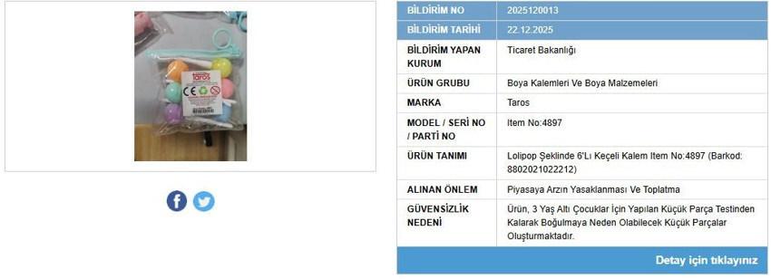Yapılan denetimlerin ardından Bakanlık, Taros markalı bir kırtasiye ürününün kullanımının güvensiz olduğunu tespit etti.